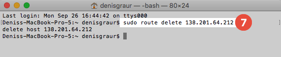 To remove the static route, type: sudo route delete yyy.yyy.yyy.yyy (7).