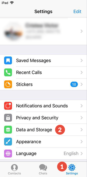 Tap on Settings (1) and tap on Data and Storage (2).